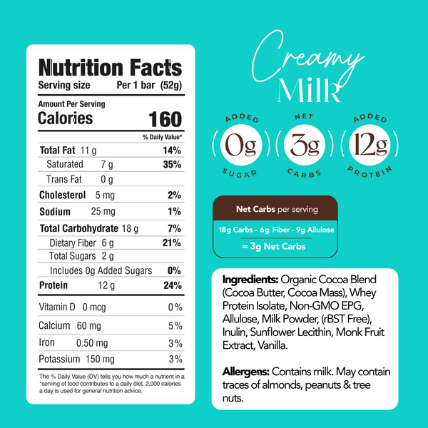 Keep carbs in check with only 3g of net carbs or less per bar.